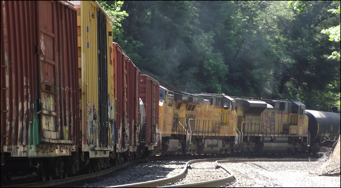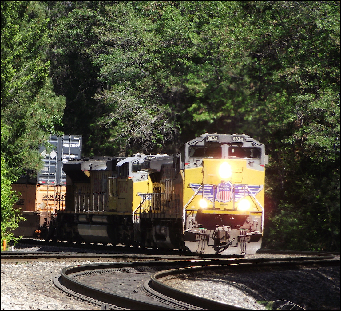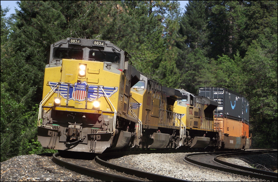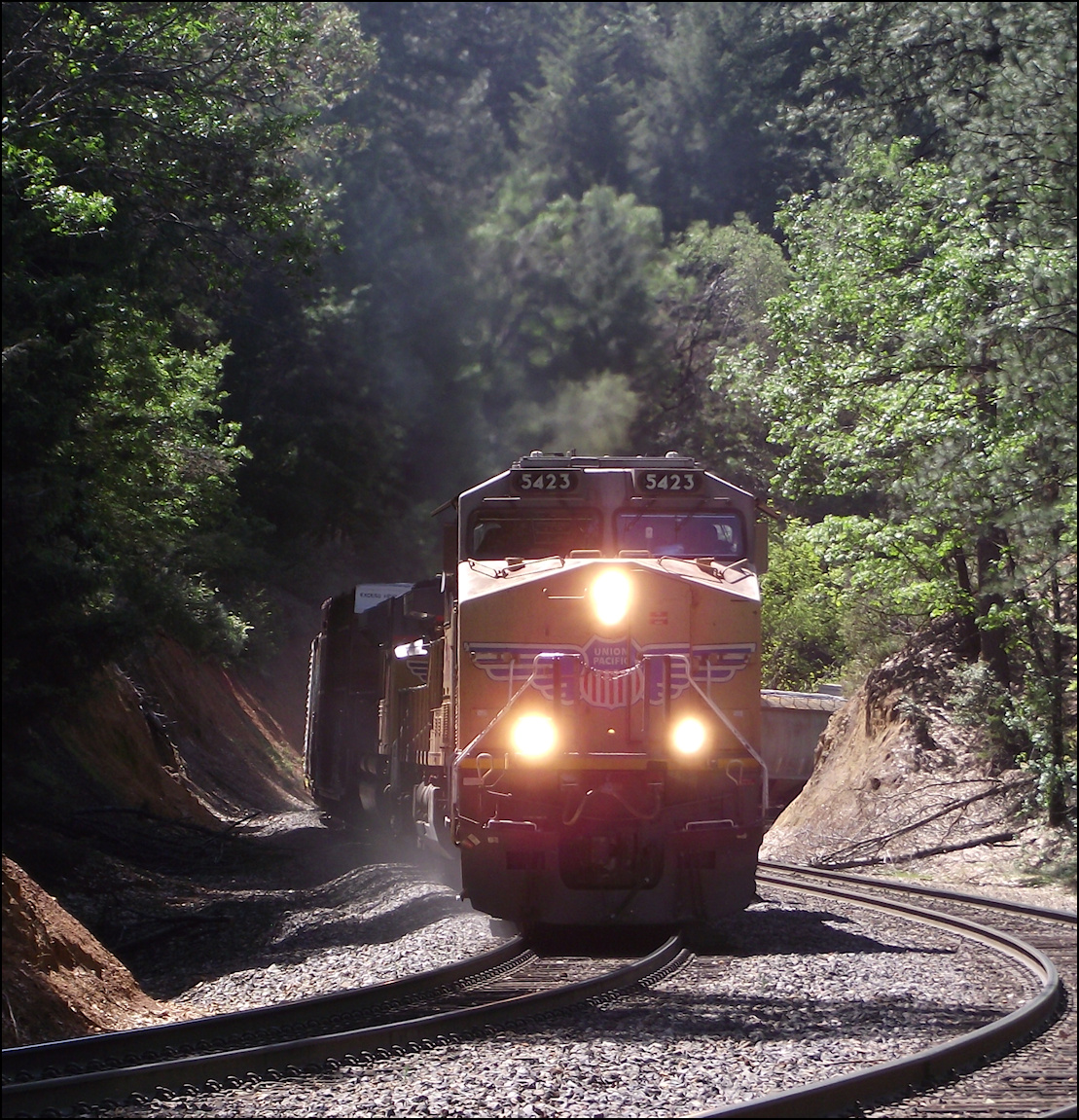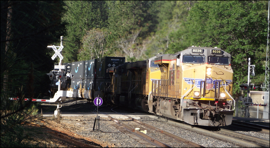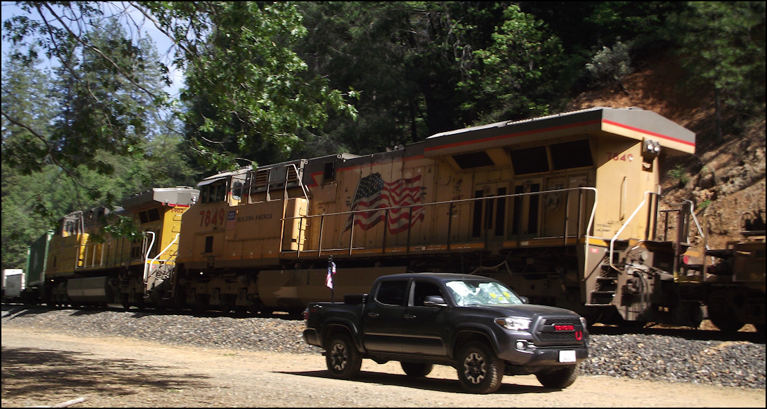 After enjoying an amazing breakfast of prime rib and eggs, at Edelweiss Restaurant 2, located in Auburn, it was time to hit the Roseville Subdivision, in the Gold Run area of Placer County, to enjoy a few hours of Saturday railfanning mainline Union Pacific Railroad action. Today was Saturday, April 04, 2026, a bright, mild and beautiful day... which made a perfect day for railfanning. Photo: Saturday morning, April 04, 2026, at exactly 08:51 the green light lit up for the #2 track at the Gold Run Crossover, at M.P. 152.8, and this began my day the right way. Naturally the #2 track is red. Photo: At 08:59, the first train of my day was ILCKC, with #8039 on the point, a GE ES44AC, heading east at Lincoln Rd., M.P. 152.48, at the Lincoln Rd. Crossing, at the west end of Gold Run. This train was morning around 25 mph, up the 1.5% grade, and putting on quite a show. Thanks to the steep grade, it took 8 minutes for the train to arrive after the green light was signaled. Photo: Amtrak #100, a P42DC leads train #6 east, the "California Zephyr," complete in the Midnight Blue 50th Anniversary paint `” . This unit was a welcome surprise! The time was 12:05 in the afternoon, and she was right on schedule. Thanks to the drag detector located at M.P. 148.9, I heard he coming well in advance. Just for the record, I'm a Amateur (ham) Radio Operator, with the call of WS6L. I've been into radio as long as I've been interested in railroads, which is my entire life. I use a ham rig, a Baofeng BF-F8HP PRO transceiver, which does double duty as a ham rig, and a railfan scanner. Keep in mind that anybody can listen, but you must have a valid Amateur Radio Operator license to transmit. Photo: After #6 rolled by, I relocated to a new location, at M.P. 151.5, near the end of a dirt/gravel railroad access road. You have to be a local to know about this road, and if you choose to photo at this location, a four wheel drive vehicle would be highly recommended. At 12:38 in the early afternoon, I was treated to eastbound MRVNP, lead by $5423, a AC45ACCTE. The grade isn't nearly as steep here, as it's around 1%, so she was making great time. Photo: I never get tired of watching mid-train DPUs doing their part to get the train over Donner Summit. Photo: My last train of the day was ZCSLT west, headed by #8834, a EMD SD70AH, which was a welcome change from the parade of all-too-common GE units that populate the Roseville Subdivision. This beautiful train was heading downgrade, into the beautiful sunshine when I photographed it at 14:46 in the afternoon, at M.P. 151.5. Photo: U.P. #8834 gets "in my face" as she rounds the curve, pulling her "Z train" of double stacks, many of them from Amazon.com. Perhaps this train is bring the new ham radio transceiver that I ordered a couple days ago? Photo: My 2020 Toyota Tacoma in it's natural habitat, beside the tracks, as the ZCSLT mid-train DPUs thunder by. I spend a lot of my time off paved roads, and my truck has the complete TRD Off-Road package with all of the goodies to keep my happy, whether I'm railfanning or exploring. The horseshoe on the grill brings me luck, as I've never been stuck or had any issues during my many adventures off the pavement. Photo: The end of the train, and it's time for me to pack up, and enjoy an early dinner after a fun and productive day of railfanning Union Pacific Railroad's Roseville Subdivision, in the Gold Run, CA area. Four trains in six hours wasn't too bad for a Saturday morning and afternoon on the Roseville Subdivision, as the day was pleasant and warm, so it was great to relax between trains, listen to the railroad radio and enjoy the beautiful Sierra Nevada mountain scenery. After the last train passed, around 14:50 in the afternoon, I packed up, and left for Hangry Howie's, located in nearby Alta, to enjoy a "Firehouse Burger" and a side of tots. That's a fitting way to end a perfect day of railfanning on U.P.'s Roseville Subdivision. Union Pacific Railroad Copyright(c) 2026 eRench Productions. All rights reserved. We've been on the web since December 22, 2002.