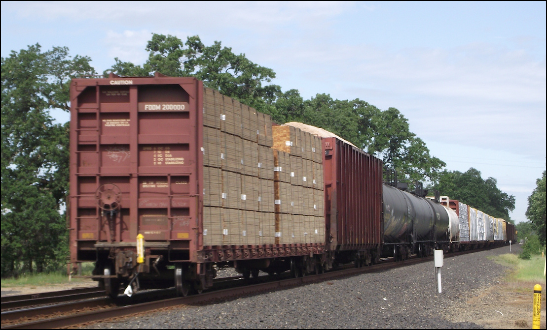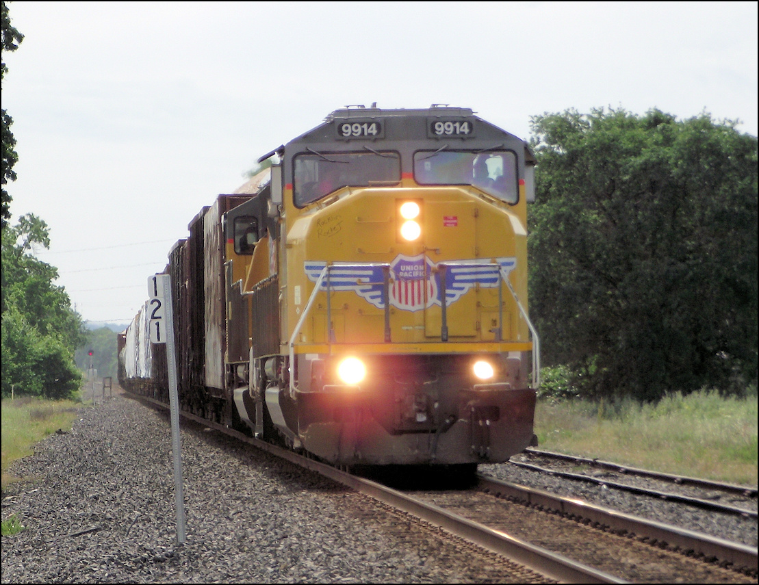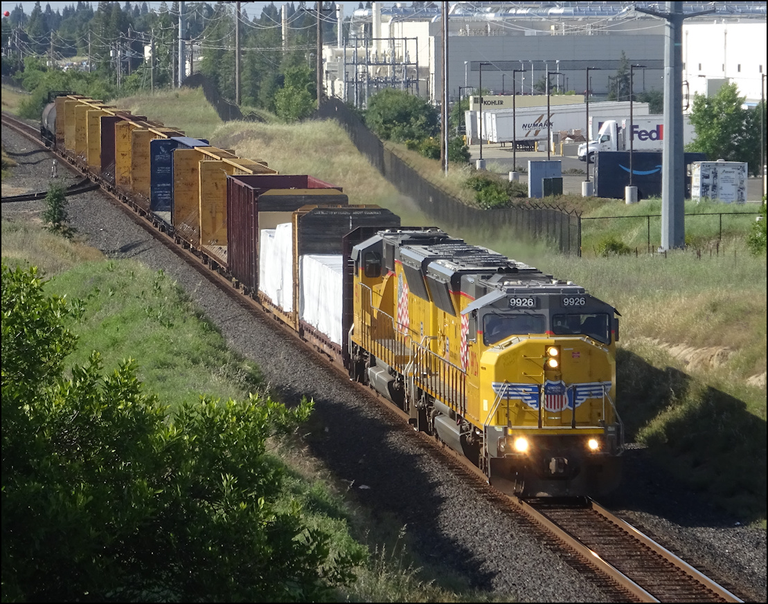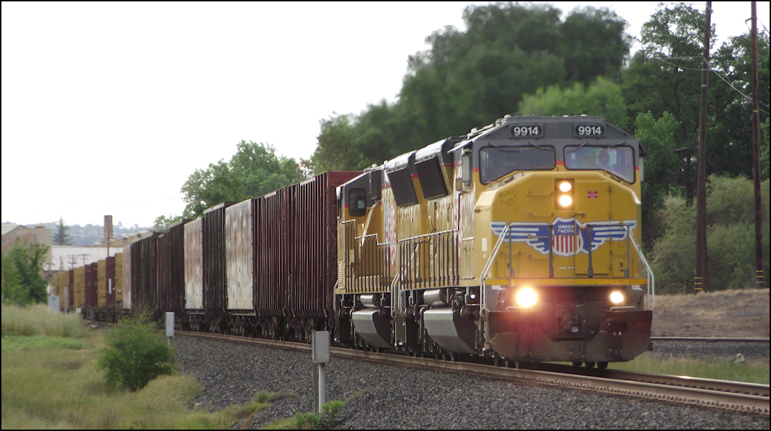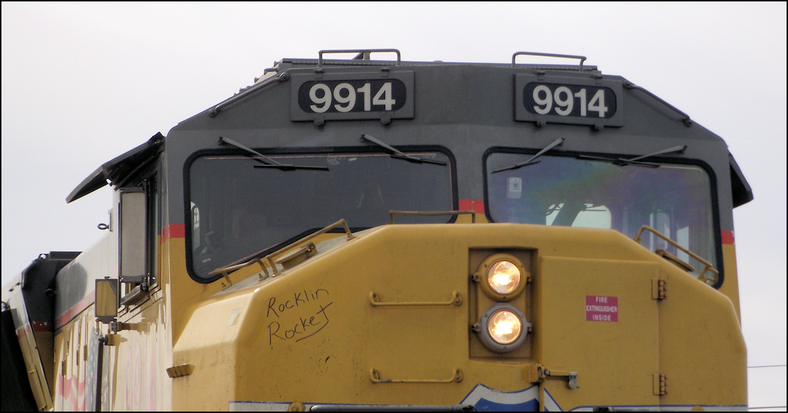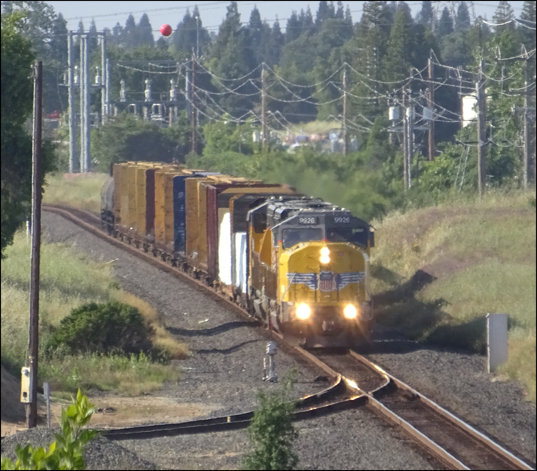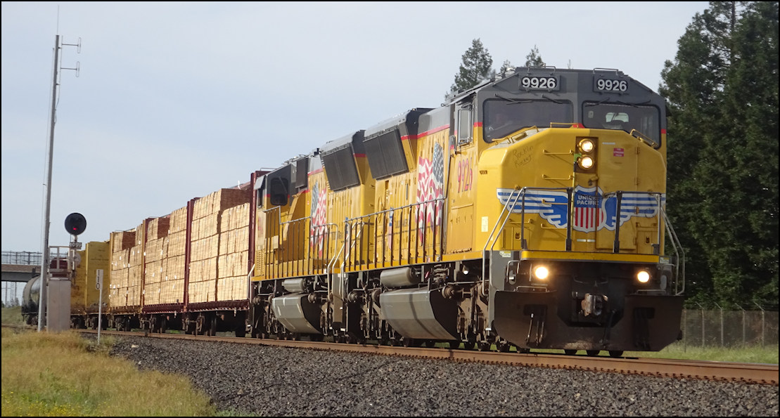 The Union Pacific Railroad "Rocklin Rocket" is a turn train that originates weekday mornings in the J.R. Davis yard, located in Roseville, CA, and works various industries on the Valley Subdivision, all the way to South Oroville, where it reverses direction, and heads home to Roseville. You'll find this train working every weekday, and occasionally on Saturday, as traffic warrants. Weekday mornings, the train is called out of J.R. Davis yard at 08:00, and usually leaves the yard between 08:45 and 09:00, with normally the first stop at Sierra Pacific Industries, about 5 miles north - Railroad timetable east - of Lincoln. After Lincoln, the Rocket normally highballs to South Oroville, where is works Georgia Pacific, and works other industries on the way back to Roseville, including Sierra Silica Products, Oroville Flexible Packaging, and other Oroville area industries, along with a occasional stop in Ostrum, west of Marysville. Photo: It's exactly 09:07 in the morning, Tuesday, April 28, 2027 and U.P. #9926 leads the "Rocklin Rocket" east, at M.P. 109.4, and the "Industrial Blvd." spur that leads to Lancaster-Burns Construction, who mostly receives incoming cars of loaded plywood. Today's "Rocket" is leaving Roseville yard on time, dispite having to wait for the MHKRV to enter the yard. "Rocklin Rocket" is called weekdays at 08:00 and originates at J.R. Davis yard in Roseville, CA. "Industrial Blvd." spur is best accessed when the train is heading west, back toward the Roseville yard, so it's usually the last stop before the "Rocket" ties up in the yard for the night. Photo: "Rocklin Rocket" highballs east up the Valley Subdivision to Sierra Pacific Industries, which will likely be the first stop and this Tuesday turn. "Rocklin Rocket" operates weekdays and if traffic warrants, occasionally on Saturday.