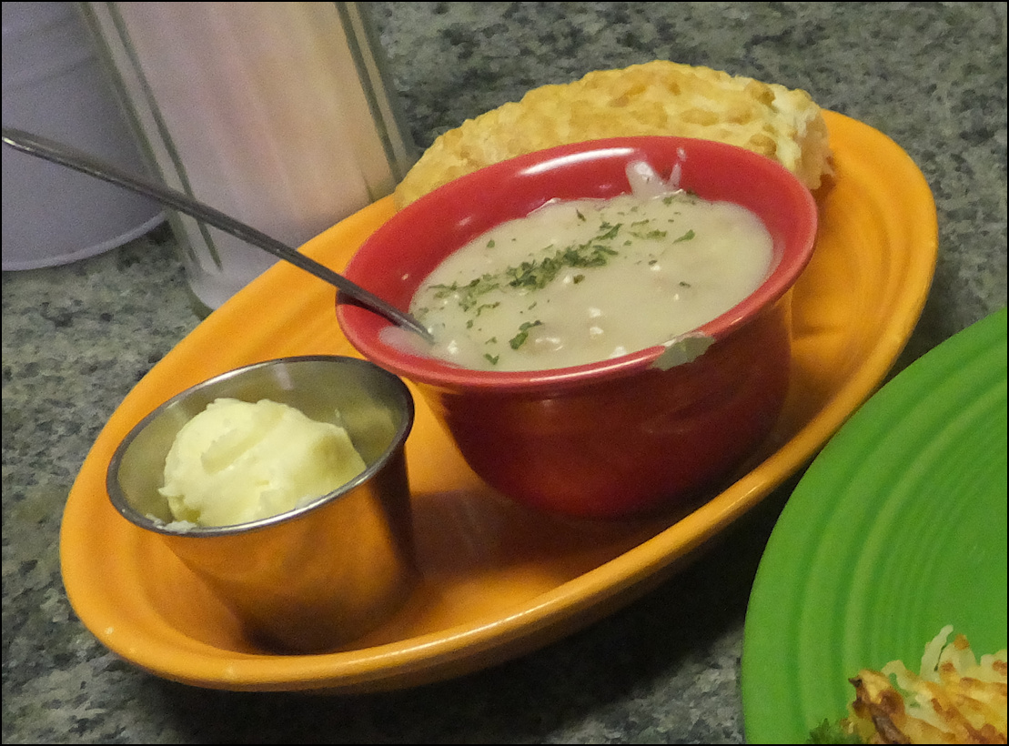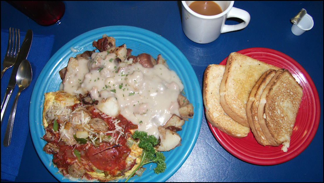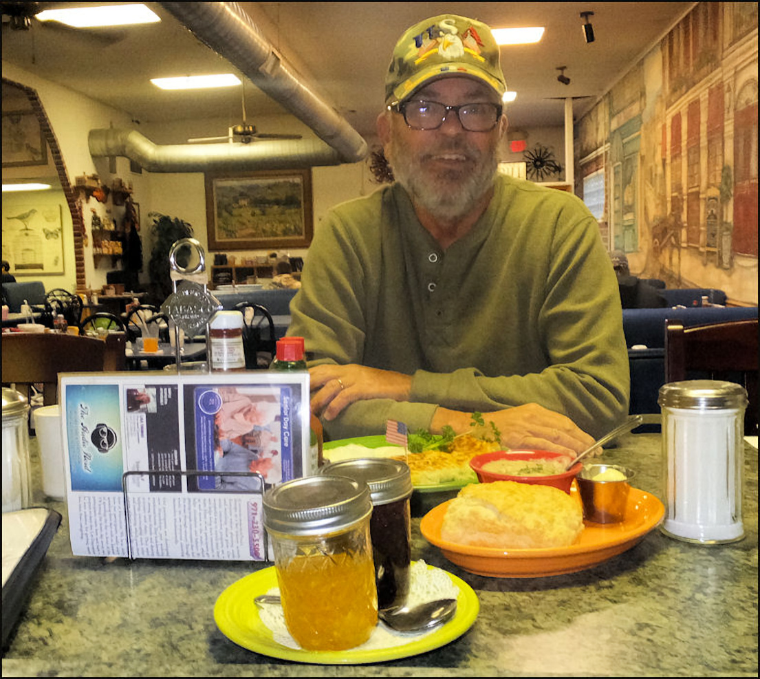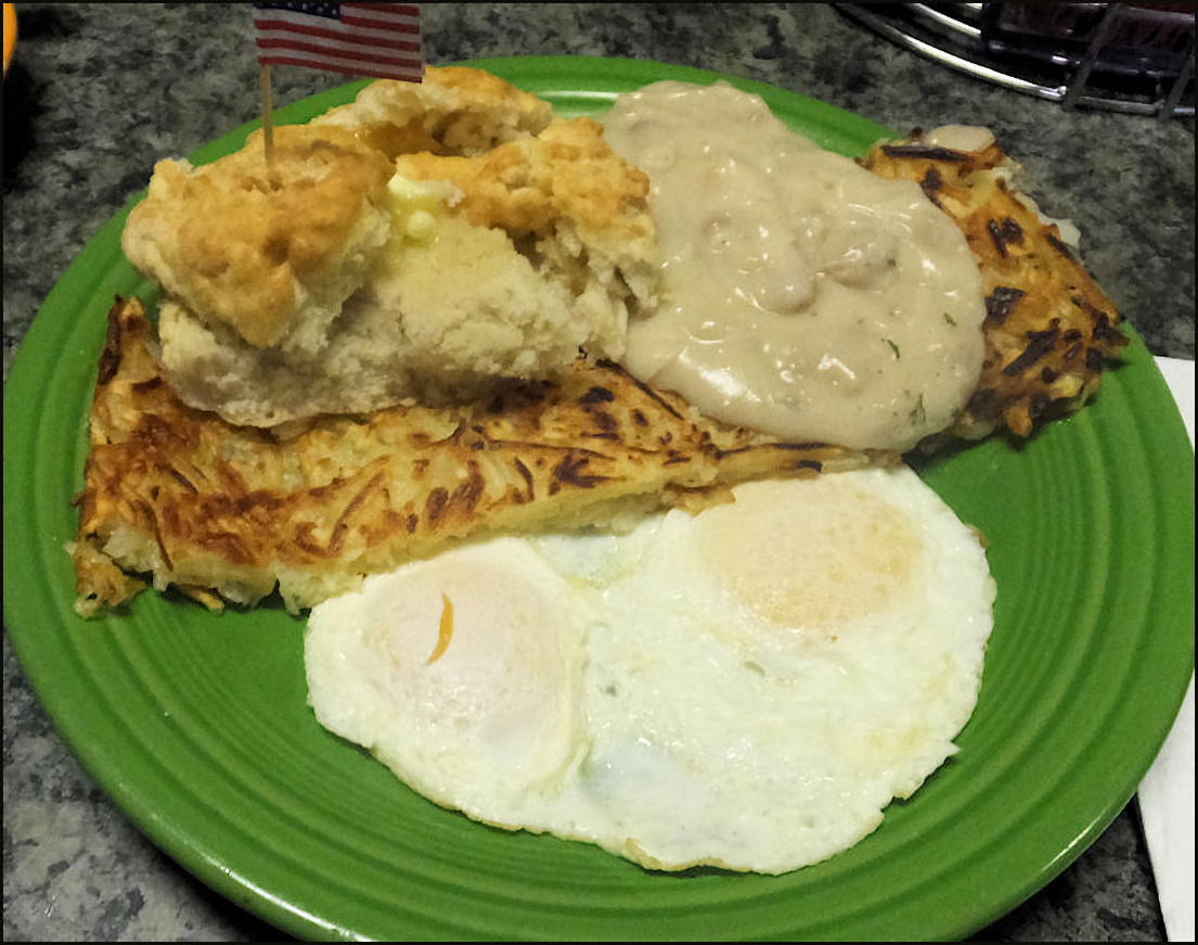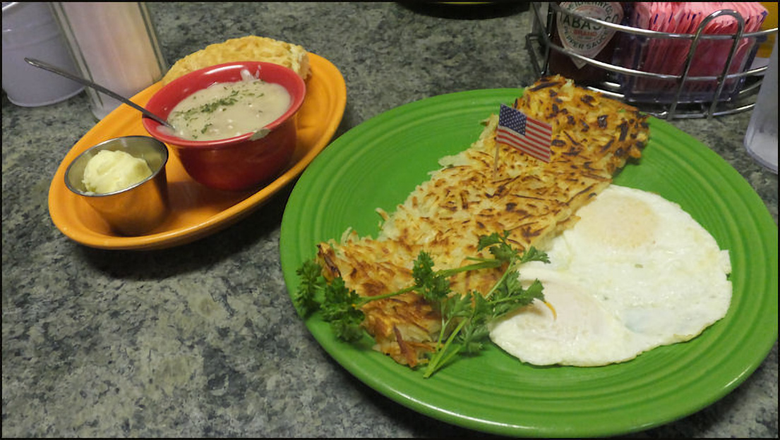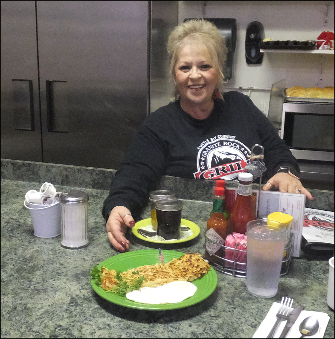 Photo: Meet friendly Kay Gardner, my server today, who just happens to be the owner of the restaurant. My hash brown potatoes and eggs have arrived with a smile, along with my biscuit and cup of gravy, which were delivered after the photo was taken. Update: Kay opened the restaurant back in 2004, as another chapter in her long career of serving delicious cuisine, and providing friendly service. Sadly, she passed away in 2023... her warmth, friendly personality and welcoming grace will be missed by the greater Rocklin community. The western Placer County dining scene was elevated to a new level of excellence, thanks to Kay's guidance. She is missed. Photo: Kay snaps my photo, as I prepare to enjoy a delicious breakfast at Granite Rock Grill. Photo: My "Kay's" breakfast - named after the owner - of hash brown potatoes, two eggs, along with biscuit and gravy. You get your choice of hash brown or country potatoes, and your choice of a biscuit, or several varieties of toast. The gravy is extra, but well worth the small price of admission. This breakfast was PERFECT in every way! No wonder the restaurant advertises as the "Home of the BEST breakfast in the greater Sacramento Valley/Placer area," as today's breakfast is definitely one of the better breakfasts that I've enjoyed in a long time. Note: You MUST order the gravy, as it's pure heaven!
