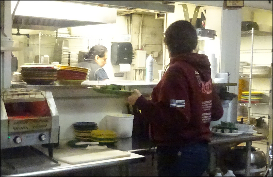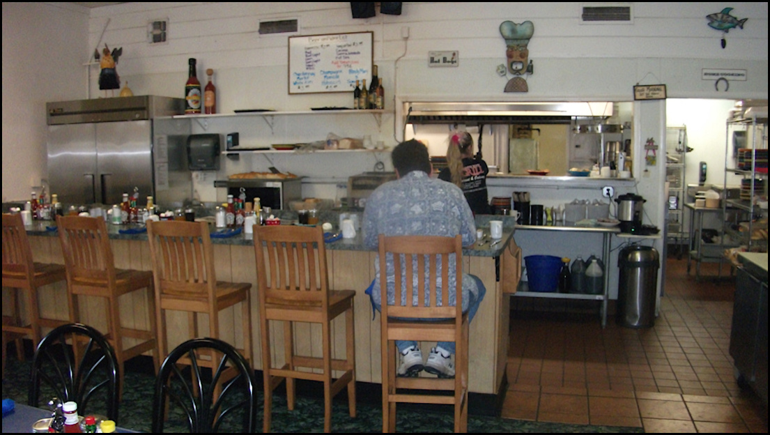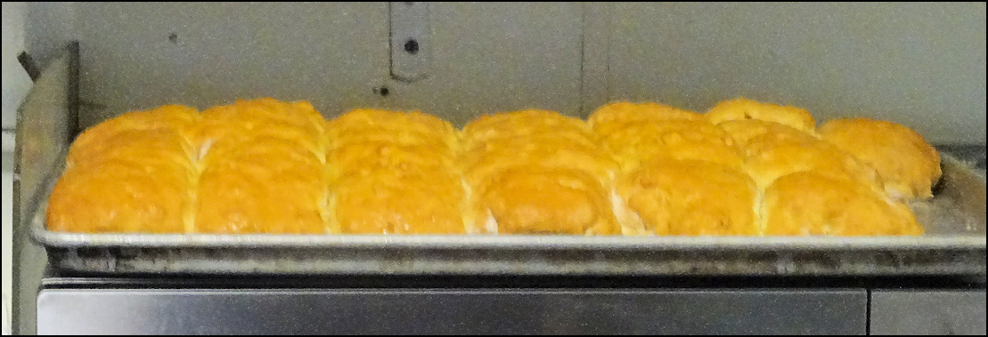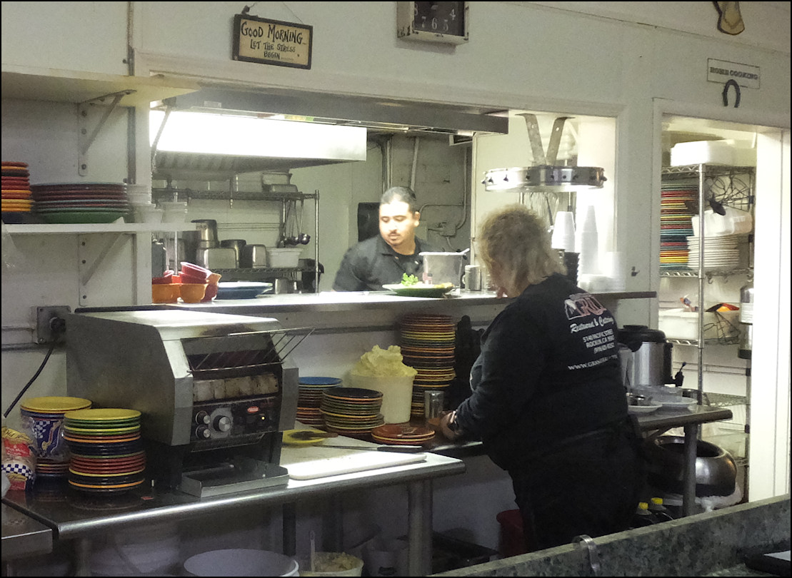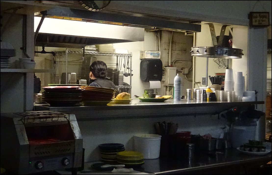 Photo: My server, Kay reaches for my breakfast, after it's been passed to her from the kitchen window. The kitchen is partially visible from the counter, which is always a plus for me. Note the "old school" order wheel, which is used to convey orders to the kitchen, just like it was done in the 1950's. The freshly-baked ban of biscuits is to the left of the photo. Kay asked me if I wanted a center or an end biscuit - I pondered the question for a few seconds, as I'd never been asked that question before - and I decided on a end biscuit. I remarked to her that would probably be my most difficult decision of the day, and she got a laugh out of that.