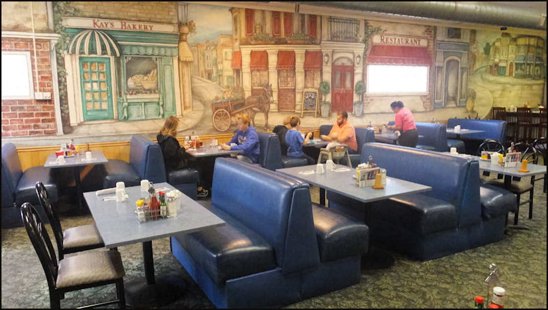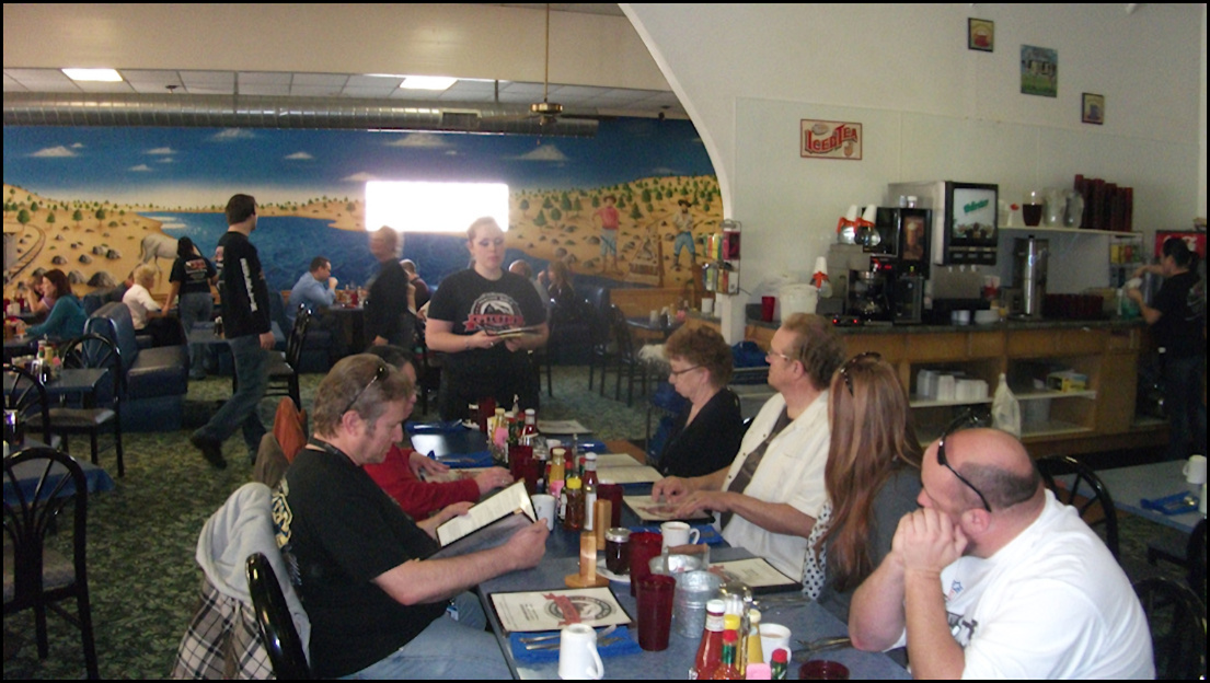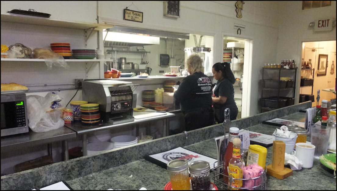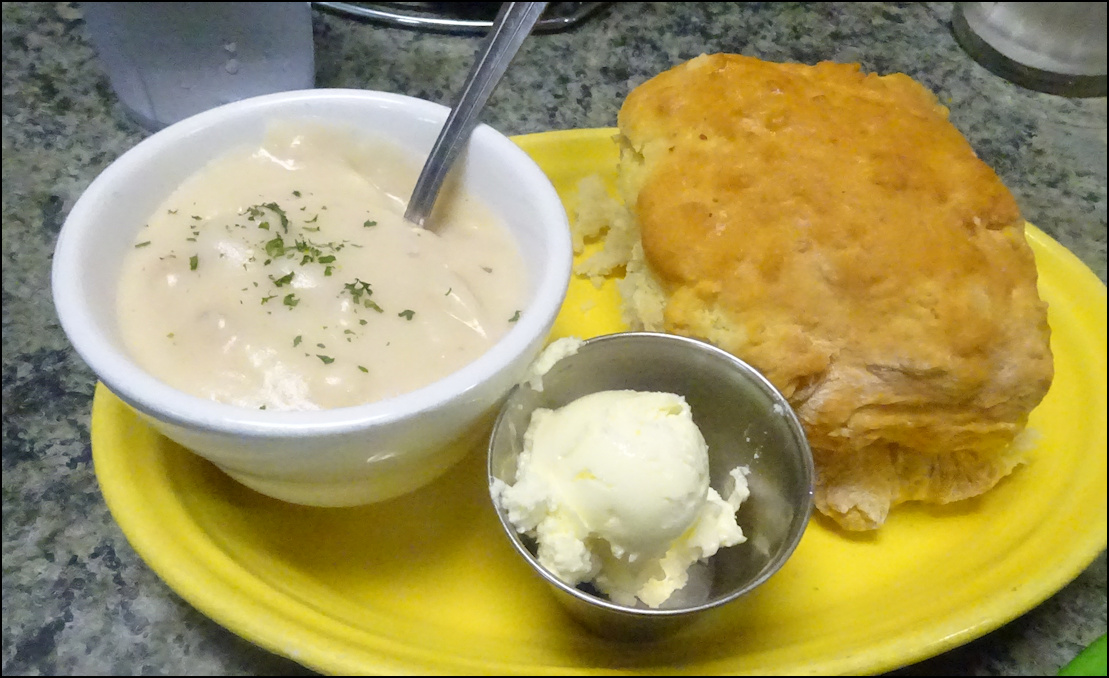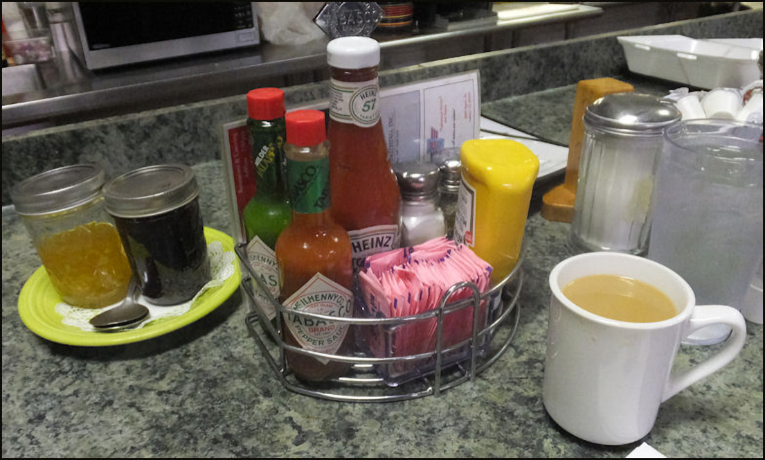 Photo: My server, Kay reaches for my breakfast, after it's been passed to her from the kitchen window. The kitchen is partially visible from the counter, which is always a plus for me. Note the "old school" order wheel, which is used to convey orders to the kitchen, just like it was done in the 1950's. The freshly-baked ban of biscuits is to the left of the photo. Kay asked me if I wanted a center or an end biscuit - I pondered the question for a few seconds, as I'd never been asked that question before - and I decided on a end biscuit. I remarked to her that would probably be my most difficult decision of the day, and she got a laugh out of that.