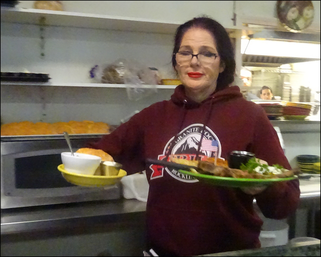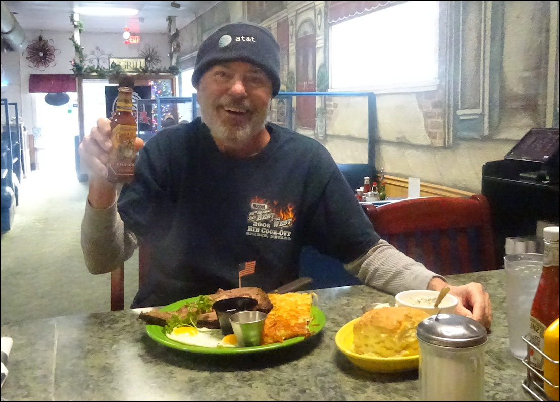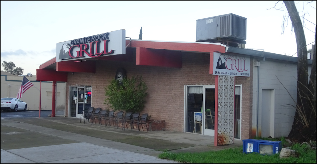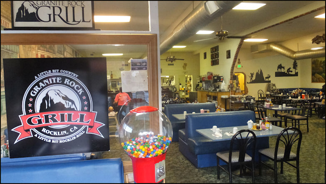 Since 2004, Granite Rock Grill has been a favorite breakfast and lunch restaurant for Rocklin, CA locals, and is a destination for "foodies" all over western Placer County, and the greater Sacramento area. The food is simply delicious, the presentation is stunning, the price is right, and the staff is super friendly, and will treat you like a rock star. As an added bonus, if you're a lover of hot sauce, you'll enjoy one of the largest selection of hot sauces, that's bigger than your imagination! As with all restaurant reviews I publish, I have no affiliation with the restaurant reviewed, and there is no monetary gain on my part, as I am simply a person who likes to eat, and I love to write-up, and publish my dining experiences. Photo: It's just past the 07:30 morning opening time, Friday, December 26, 2025, and I've arrived at Granite Rock Grill, located in Rocklin, CA, to enjoy a special holiday breakfast of "Prime Rib and Eggs." The newspaper rack must have blown over thanks to yesterday's rain and wind storm. Back in the day, Rocklin was known for granite quarries, hence the name of the restaurant. However, there is a single, HUGE granite rock in back of the restaurant, and I wonder... was the restaurant named after that big rock? I should have asked. Photo: Granite Rock Grill is open for breakfast and lunch, every day of the week, and these holiday hours were posted on social media. Normal business hours are 06:30 AM to 2:00 PM. The advertisement for today's special breakfast was listed on another social media post. Photo: It's the day after Christmas, and the restaurant is festively decorated for the holiday. I arrived just after the 07:30 opening time, as I was hungry for prime rib. Photo: The dining room is very spacious, and furnished with booths and tables of many sizes. Each table is set with condiments, including two bottles of Tabasco sauce, which for a reason I don't understand is the most popular hot sauce on the west coast. The breakfast counter is located at the extreme far end of the dining room, next to the kitchen. The dining room includes a cheery fireplace but it wasn't lit today. No worries for me, as I sat at the counter. Photo: The spacious breakfast counter is located at the rear of the restaurant, next to the kitchen. When I dine by myself, I prefer to sit at the counter, as I can chit-chat with the staff and watch them in action. It's also makes a great vantage point for photography. Photo: The first page from the menu listing classic breakfast favorites. The founder of the restaurant, Kay Gardner, named menu selections after friends and customers who frequently ordered the dishes that bear their names. "Prime Rib and Eggs" isn't listed on the menu, or on the restaurant's website. Photo: After placing my breakfast order, I sat at the counter, admiring the pan of freshly baked biscuits the baker had just taken out of the oven. The smell was heavenly! Photo: At the front of the restaurant, near the checkout counter, the "Firecracker Station" is mounted on the wall, and offers a wide array of hot sauces, Californian, Mexican and practically anything you can imagine. Each table is set with two varieties of Tabasco hot sauce, but if you long for something else, the "Firecracker Station" is for you to enjoy. You simply grab a bottle of your choice, bring it over to your table and enjoy. As a courtesy to the staff and to your fellow diners, it would be great to return the bottle to the shelf when you're finished enjoying. Sauce is put on the shelves according to the degree of heat. I went with a bottle of Cholula Hot Sauce, the "Chipotle" version, which is among my favorites, although Pepper Plant "Roasted Garlic" is up there. It was a difficult choice, but I went with the Cholula for today's breakfast. Today I didn't see any Valentina Salsa Picante, which is usually present, but the rotation of sauces is varied and endless. Photo: My breakfast has just been placed at the kitchen window and is ready be delivered to me, as I sit at the counter. Notice the "old school" order wheel, which is not used any more and is now simply a decoration, as my friendly server, Rebecca, took my order using a small handheld device. Photo: My server, Rebecca, grabs my breakfast to deliver it to me where I'm sitting, maybe ten feet distant. Photo: Meet Rebecca, my amazingly friendly server, who engaged me in friendly conversation and treated me like a member of her family. Photo: I toast Rebecca, the friendly staff, and my amazing breakfast with a bottle of Cholula hot sauce, as I'm ready to enjoy one of the best breakfasts in western Placer County. This was a breakfast that all breakfast lovers, and "foodies" would crave!