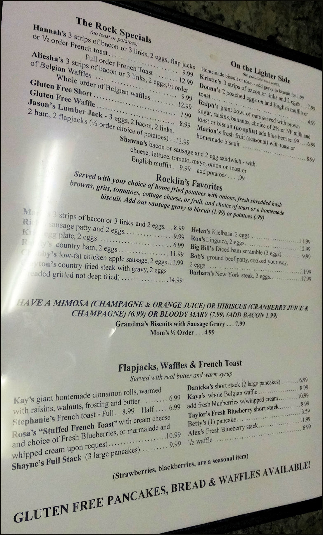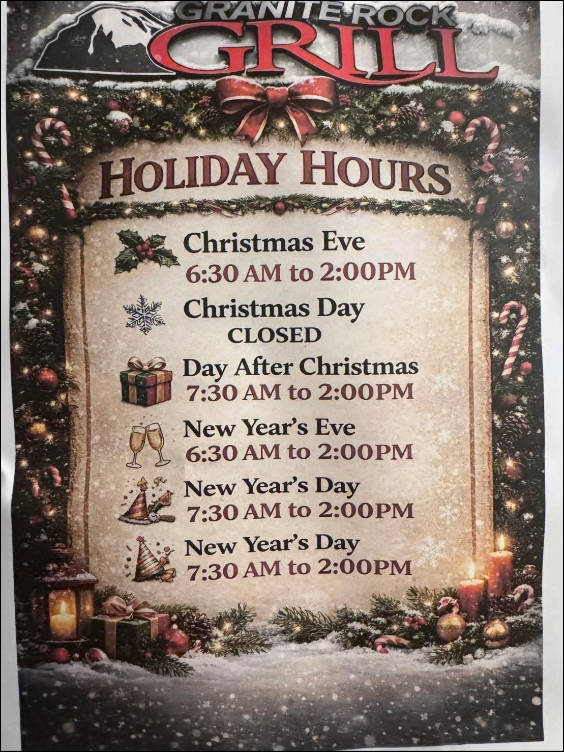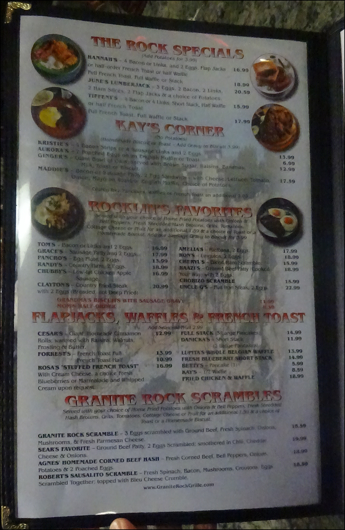 Since 2004, Granite Rock Grill has been a favorite breakfast and lunch restaurant for Rocklin, CA locals, and is a destination for "foodies" all over western Placer County, and the greater Sacramento area. The food is simply delicious, the presentation is stunning, the price is right, and the staff is super friendly, and will treat you like a rock star. As an added bonus, if you're a lover of hot sauce, you'll enjoy one of the largest selection of hot sauces, that's bigger than your imagination! As with all restaurant reviews I publish, I have no affiliation with the restaurant reviewed, and there is no monetary gain on my part, as I am simply a person who likes to eat, and I love to write-up, and publish my dining experiences. Photo: It's just past the 07:30 morning opening time, Friday, December 26, 2025, and I've arrived at Granite Rock Grill, located in Rocklin, CA, to enjoy a special holiday breakfast of "Prime Rib and Eggs." The newspaper rack must have blown over thanks to yesterday's rain and wind storm. Back in the day, Rocklin was known for granite quarries, hence the name of the restaurant. However, there is a single, HUGE granite rock in back of the restaurant, and I wonder... was the restaurant named after that big rock? I should have asked. Photo: Granite Rock Grill is open for breakfast and lunch, every day of the week, and these holiday hours were posted on social media. Normal business hours are 06:30 AM to 2:00 PM. The advertisement for today's special breakfast was listed on another social media post. Photo: It's the day after Christmas, and the restaurant is festively decorated for the holiday. I arrived just after the 07:30 opening time, as I was hungry for prime rib. Photo: The dining room is very spacious, and furnished with booths and tables of many sizes. Each table is set with condiments, including two bottles of Tabasco sauce, which for a reason I don't understand is the most popular hot sauce on the west coast. The breakfast counter is located at the extreme far end of the dining room, next to the kitchen. The dining room includes a cheery fireplace but it wasn't lit today. No worries for me, as I sat at the counter. Photo: The spacious breakfast counter is located at the rear of the restaurant, next to the kitchen. When I dine by myself, I prefer to sit at the counter, as I can chit-chat with the staff and watch them in action. It's also makes a great vantage point for photography. Photo: The first page from the menu listing classic breakfast favorites. The founder of the restaurant, Kay Gardner, named menu selections after friends and customers who frequently ordered the dishes that bear their names. "Prime Rib and Eggs" isn't listed on the menu, or on the restaurant's website. Photo: After placing my breakfast order, I sat at the counter, admiring the pan of freshly baked biscuits the baker had just taken out of the oven. The smell was heavenly! Photo: At the front of the restaurant, near the checkout counter, the "Firecracker Station" is mounted on the wall, and offers a wide array of hot sauces, Californian, Mexican and practically anything you can imagine. Each table is set with two varieties of Tabasco hot sauce, but if you long for something else, the "Firecracker Station" is for you to enjoy. You simply grab a bottle of your choice, bring it over to your table and enjoy. As a courtesy to the staff and to your fellow diners, it would be great to return the bottle to the shelf when you're finished enjoying. Sauce is put on the shelves according to the degree of heat. I went with a bottle of Cholula Hot Sauce, the "Chipotle" version, which is among my favorites, although Pepper Plant "Roasted Garlic" is up there. It was a difficult choice, but I went with the Cholula for today's breakfast. Today I didn't see any Valentina Salsa Picante, which is usually present, but the rotation of sauces is varied and endless. Photo: My breakfast has just been placed at the kitchen window and is ready be delivered to me, as I sit at the counter. Notice the "old school" order wheel, which is not used any more and is now simply a decoration, as my friendly server, Rebecca, took my order using a small handheld device. Photo: My server, Rebecca, grabs my breakfast to deliver it to me where I'm sitting, maybe ten feet distant. Photo: Meet Rebecca, my amazingly friendly server, who engaged me in friendly conversation and treated me like a member of her family. Photo: I toast Rebecca, the friendly staff, and my amazing breakfast with a bottle of Cholula hot sauce, as I'm ready to enjoy one of the best breakfasts in western Placer County. This was a breakfast that all breakfast lovers, and "foodies" would crave!