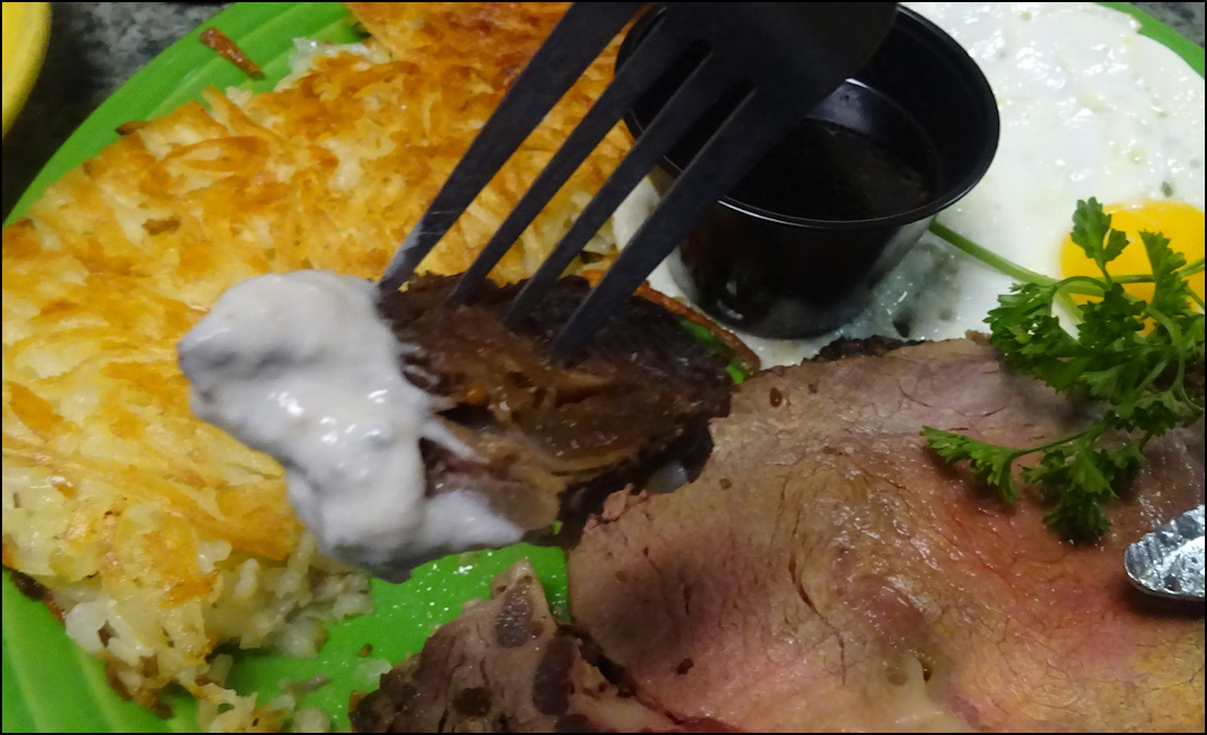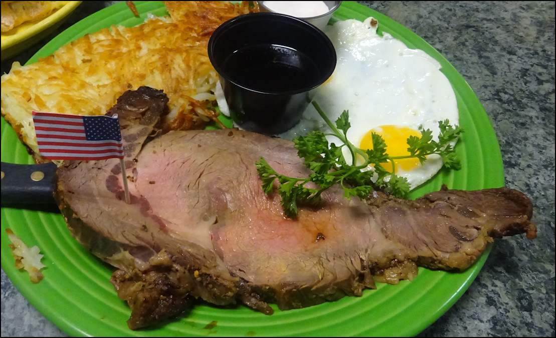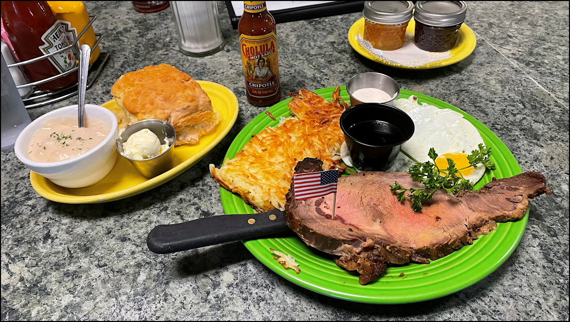 Photo: Holidays and special occasions call for a special meal, and on several holidays during the year, Granite Rock Grill showcases a breakfast of prime rib and eggs. This amazing breakfast isn't listed on the menu, but the restaurant publishes the date on social media, usually a few days in advance. Today, which was the Day-After-Christmas was a prime rib day - the restaurant was closed for Christmas Day - and the celebrate the occasion, I ordered a breakfast of prime rib, hash brown potatoes, fried eggs, a freshly baked biscuit, along with an optional side of sausage gravy. Notice the stunning presentation of this amazing breakfast... and it tasted even better than it looked! You enjoy a large slab of prime rib - most likely around 12 ounces - cooked to order, choice of potatoes, eggs cooked your way, with choice of toast or a biscuit. I can't even think of enjoying a biscuit without gravy, so I went with an optional side of gravy, which was a wise choice, as the gravy was as good as it gets. This is a breakfast event custom-tailored for the tastes of Rocklin locals, and for breakfast lovers all over the greater Sacramento area and beyond. The "Prime Rib Breakfast" is one of the finest breakfast served in western Placer County, or maybe even the state of California. It's truly a breakfast for those who savor premium dining for breakfast! I've enjoyed $70.00 breakfast splurges during trips to Las Vegas, but nothing in my breakfast book compares to the prime rib breakfast served at Granite Rock Grill. Talk about breakfast overload to get my Friday morning going! Your perfect morning begins with a large 12-oz or so cut of choice prime rib beef, which was flavorful, melt-in-your-mouth tender, juicy and cooked to order by the talented chef. Today, I went my beef cooked medium, but if medium isn't for you, the talented kitchen staff will be more than happy to grill your prime rib exactly the way you order. The meat was perfectly cooked, tender, flavorful and simply delicious! Not only was it fork-tender and delicious, it was simply beautiful to look at and it was almost to pretty to cut... well... almost... Oh... I almost forgot to mention today's presentation was a work of culinary art, as the slab of beef was medium brown around the edge, but a tender pinkish inside... tender, juicy and delicious, just the way I love it! This is a slab of prime rib to savor and enjoy as a late Christmas present! As an added bonus, a small cup of horseradish sauce AND a cup of au jus were on the plate, to dip your prime rib into. If that wasn't enough, there was the optional bowl of gravy on the side! Such a difficult choice! I alternated between dipping the prime rib in the sauce and the juice, and left the gravy for the biscuit and hash browns. The large slab of hash brown potatoes made the perfect side dish. As in all "old school" diners, the hash browns were golden crispy and crunchy on the outside, and tender, white and juicy on the inside, which made perfect hash brown potatoes. They had just the right amount of salt, golden crispness, and just a little "crunch" on the outside. Simply delicious! Enjoyed as a side dish to the prime rib, dipped into the eggs, or the gravy, the hash browns were simply perfect. The pan of freshly baked biscuits got my attention, so it was natural for me to order a biscuit with my breakfast. A cup with a generous serving of soft butter came with the biscuit... what a combination, and the butter worked wonderful with the biscuit! And then there was the side of gravy... The gravy... this breakfast was "standalone delicious" but why not go the extra mile and add an optional side of sausage gravy? You won't regret it, as the gravy was thick, creamy, rich, full of flavor and included lots of thick chunks of sausage... simply perfect! The gravy could almost make for a standalone side dish, but when you dip hash browns or slices of the biscuit into the gravy... it's always great to order a side of gravy. I ordered my eggs fried sunnyside up, and they arrived fried perfectly as ordered, attractively garnished with a sprig of parsley. I confess that I used some of the Cholula Mexican Hot Sauce on my eggs, as eggs aren't complete without Cholula, as it's a sauce made for breakfast. My breakfast was delicious in every way, as the ingredients were fresh, the food was perfectly cooked, and the presentation was beautiful. Considering the quality, quantity, and the amazingly friendly service, the price was very reasonable for a prime rib breakfast. The price is "Market Value," and it varies, but it won't break your bank, and you'll leave with a full stomach and a smile on your face. Photo: My side of freshly baked biscuit, along with a scoop of soft butter, and my optional side of gravy arrived together, on a smaller, separate plate. The gravy was sprinkled with dried parsley flakes, which added to the taste and to the presentation. The biscuit was light and fluffy, with just the right amount of sweetness and texture. It had been taken out of the oven maybe twenty minutes prior, so it was as fresh as it gets. The smell of the freshly baked biscuit was sensational. I cut off small pieces from the biscuit, buttered them, and dipped each piece into the gravy. What a delicious side dish! Photo: The "main event," with a large slab of delicious prime rib beef, two fried eggs, golden hash brown potatoes, with horseradish sauce and a cup of au jus for dipping. This breakfast was delicious, and a holiday treat! The small paper American flag is a tradition, planted on every dish the restaurant serves. Photo: I cut off a small piece of the prime rib and dipped it into the creamy horseradish sauce, for a breakfast delight. Today's breakfast of "Prime Rib and Eggs" was simply amazing, and I'm at a loss of words to describe how much I enjoyed it, and how delicious it was. It's a holiday treat, offered by Granite Rock Grill on select holidays, so I plan to keep my eye on social media and take advantag